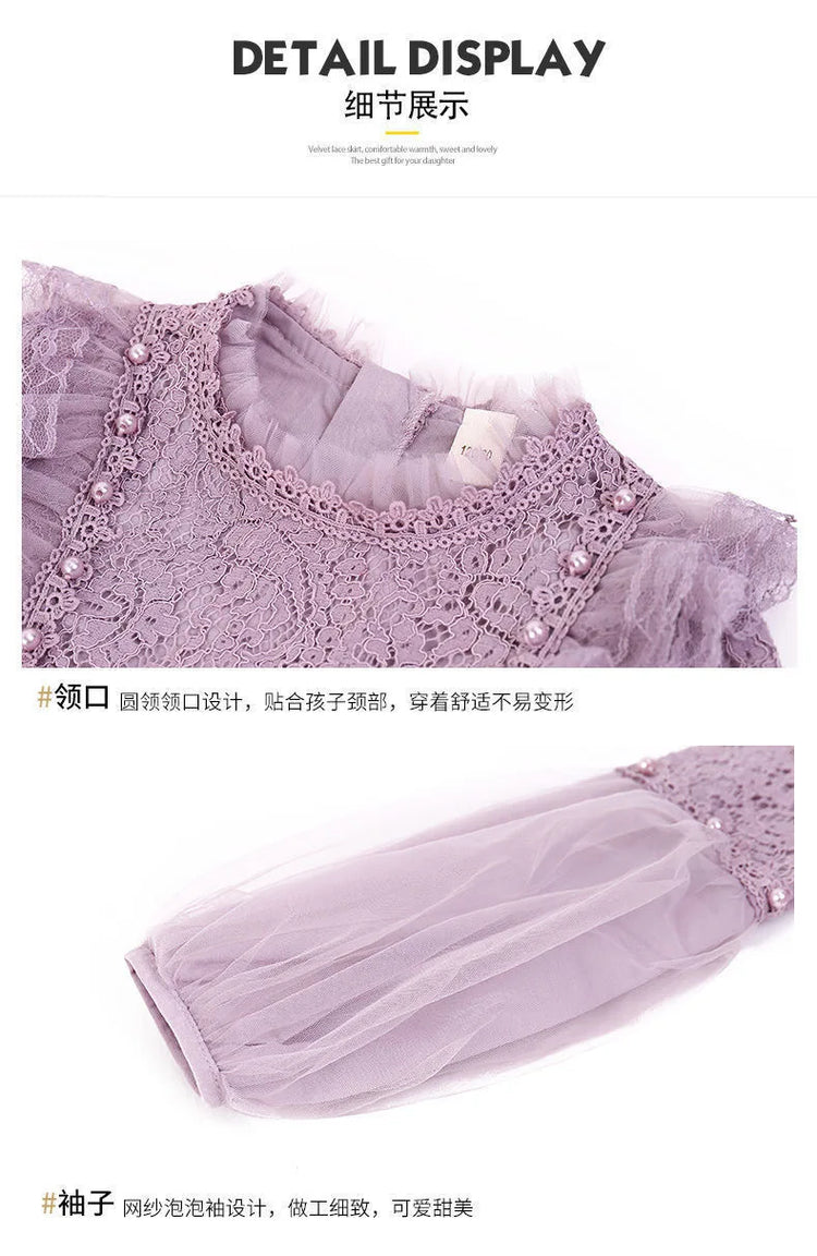 Spring Autumn Kids Girls Dresses Lantern Sleeve Lace Princess Dress Pearl Sweet O-neck Mesh Party Children's Clothing Vestidos